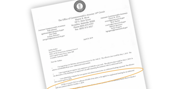 In 2019, shortly after assuming office, Muse Johnson made a formal request to the Prosecutors Advisory Council to redirect $35,000 from her own salary towards funding an additional prosecutor for her office. Muse Johnson had two prosecutors, including Rob Johnson, working alongside her and requested an additional prosecutor to help with the backlog. The request was denied.